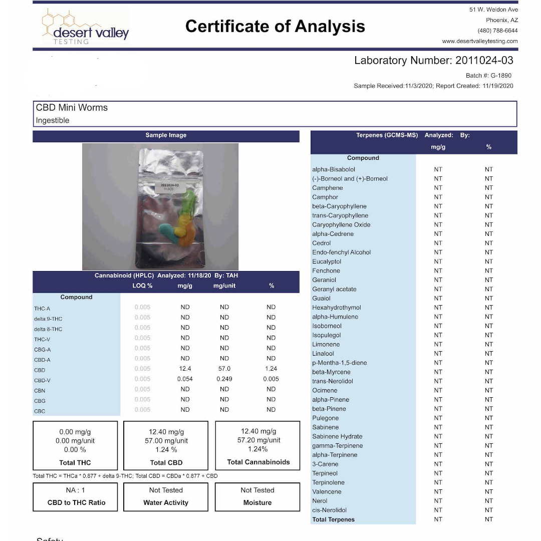 All our 50mg CBD Gummies, gummy worms, come with 50mg of CBD isolate. There are no detectable (ND) amounts of THC in this product. Like all of our gummy products, we use only the highest quality hemp-derived CBD extracts.